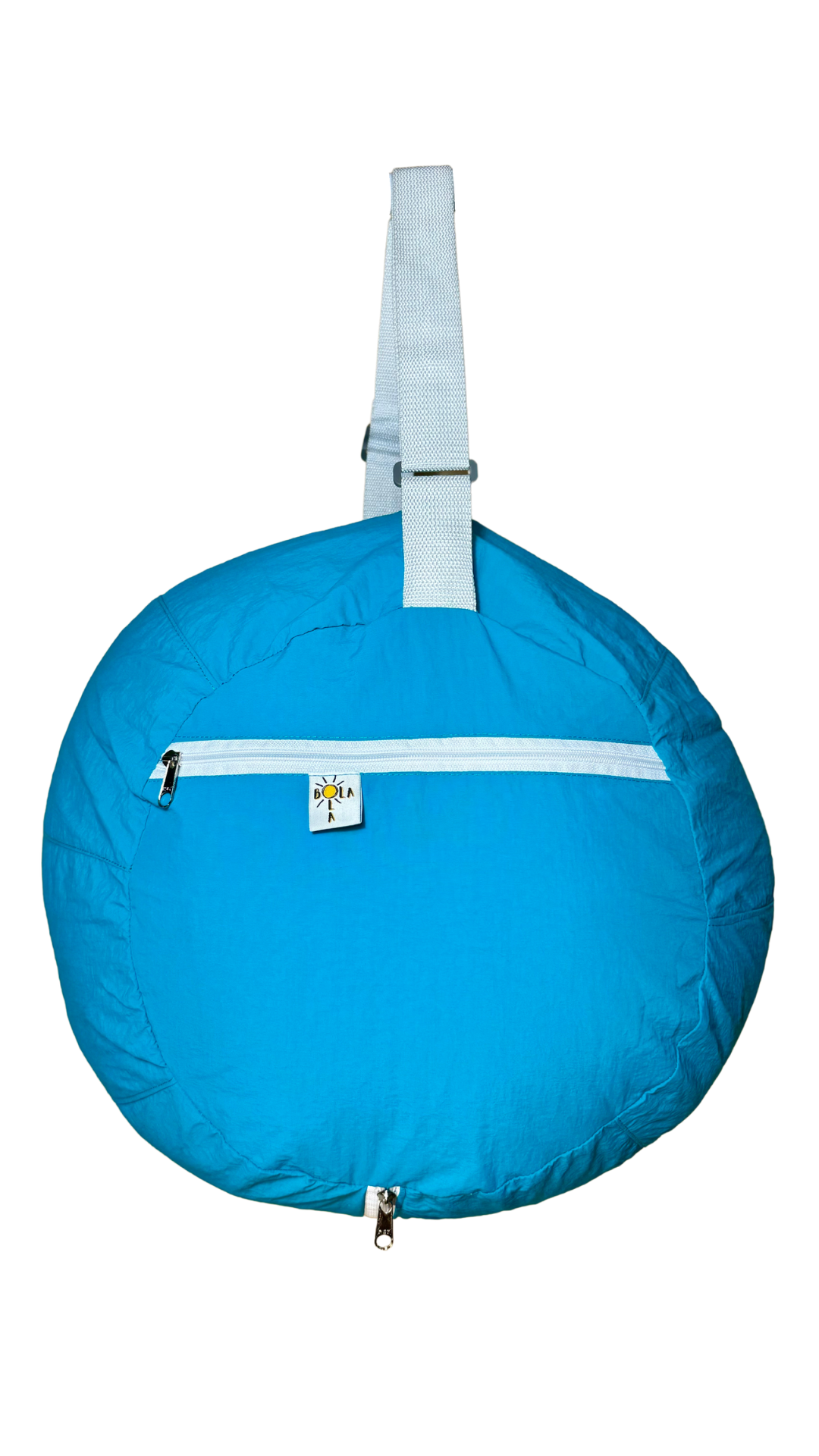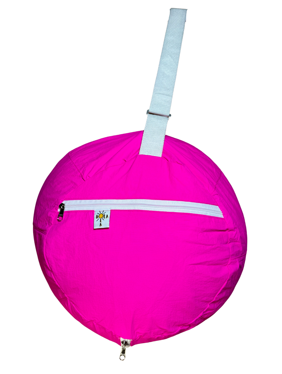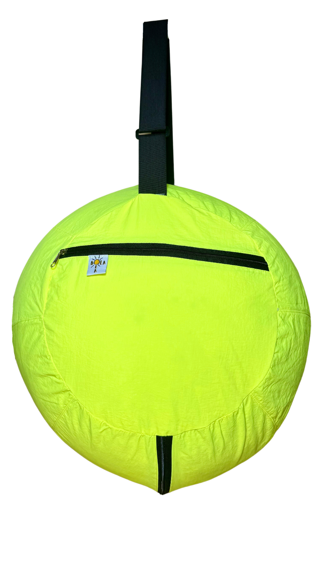 Outer Layer Features: Ola Bola's outer layer is interchangeable with different colors, water-resistant, and machine-washable in cold water with like colors. It features a sturdy adjustable strap to carry Ola Bola with ease, and a zippered compartment to keep essentials like keys, wallet, phone, tablet, and even a towel.